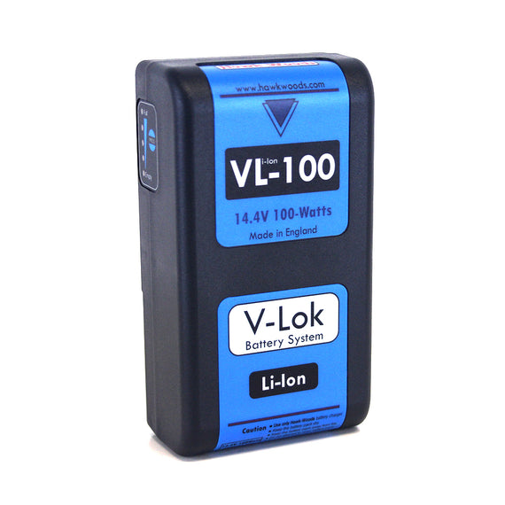 Hawk-Woods VL-100 (VL100) V-Lock Li-Ion Camera Battery 100Wh (14.4V) . The Hawk-Woods' VL-100 has been designed using the latest lithium-Ion technology. This superb battery will power a 20Watt camcorder for in excess of 4 hours constant recording time. With it's built-in fuel gauge & Hawk-Woods build quality, this high-tech Li-Ion camera battery offers stunning performance for it's size and weight.