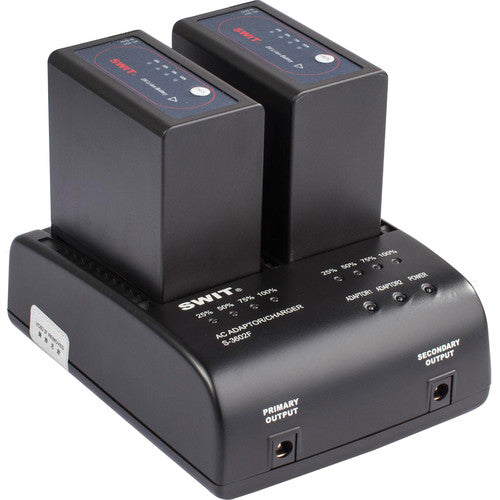 Chare the S-8972 battery using the SWIT S-3602F Dual-Channel Charger or via the DC barrel port using the SWIT S-3010D Portable Charger.
