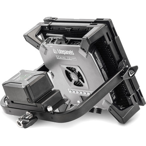 Stability, rugged construction, flexibility, and control are hallmarks of the Litepanels Gemini 1 x 1 RGB LED Soft Panel with Pole-Operated yoke and UK Power Cord. The aluminum-constructed, 12.6 x 12.6 x 4.6" fixture has multiple lighting modes including CCT, Hue, Saturation, Gel Presets, as well as an effects mode. The CCT color temperature control has six factory presets in increments from 2700 to 10,000K. There are also six presets for user-defined color temperature and plus/minus green control. The HSI Color mode allows you to adjust the hue, saturation, and intensity, while Gel mode permits your choice from a library of filters favored by filmmakers, and an effects mode provides nine different effects to work with. The light has a CRI/TLCI rating of 97 for daylight balance and 94 for tungsten balance, indicating an accurate rendition of color. The Gemini is dimmable from 100 to 0.1% without flicker or color shift, and settings and features are displayed on the rear LCD screen.
