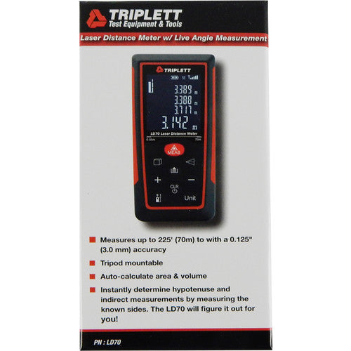 The Triplett LD70 Laser Distance Meter allows a single user to measure distances from 2" to 230'. It's designed to function with high accuracy and repeatability. The last 20 settings can be saved to internal memory. In a compact design, the LD70 is suitable for new construction, home inspection, floor and carpet installation, electrical, cable, alarm, and telecom wiring, painting, landscaping and fence installation, HVAC and heating, and other applications.