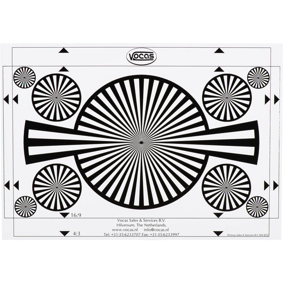 The Backfocus and White Card by Vocas is a handy tool combining a focus chart, white card, and framing guide. It is useful in the field for checking and adjusting back focus on professional video cameras with interchangeable lenses. As a white card it is used to adjust the white balance of video cameras to different color temperature of light in changing locations. The framing guide can be photographed as an aid in post production to establish the aspect ratio for the project.