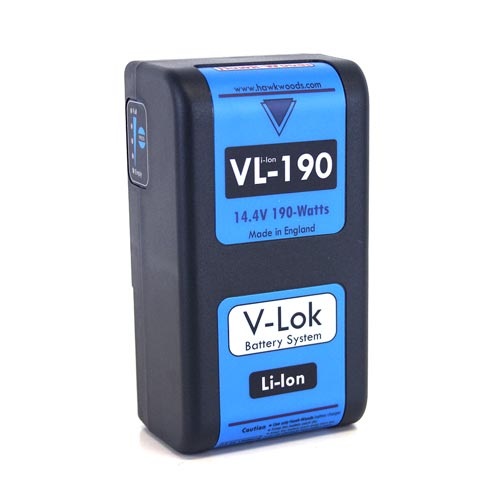Hawk-Woods VL-190 (VL190) Lithium-Ion Battery 14.4V / 190W . The Hawk-Woods VL-190 has been designed using the latest lithium-Ion technology. This superb battery will power a 20Watt camcorder for in excess of 9 hours constant recording time.With its built-in fuel gauge & Hawk-Woods build quality, this high-tech Li-Ion camera battery offers stunning performance for its size and weight.