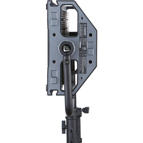 The Litepanels Gemini 2x1 RGB LED Soft Panel has a number of convenience features, such as the ability to stack and gang several lights together with an optional yoke and hardware. You can also daisy-chain multiple lights together in Master/Slave mode, allowing a single designated "Master" light to control the others. This version of the Gemini ships with a standard yoke and a UK power cable.