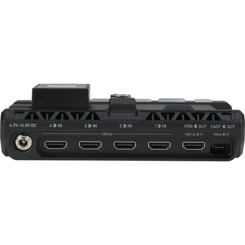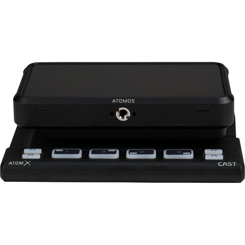 Convert your Ninja V or Ninja V+ 5" monitor into a full multi-camera broadcast studio switcher with the AtomX CAST from Atomos. The AtomX CAST takes its name from "broadcast", and it allows you to switch up to four HDMI video sources and output it to a variety of destinations such as an external monitor, a recorder, a separate switcher, or to a live streaming computer. Applications include corporate, house of worship, event, family, or studio production environments. The CAST is specially designed to mount onto the back of the Ninja V/V+ monitor, and it provides four HDMI inputs that support a mix of different resolutions up to 1080p60. The touchscreen monitor can view a single image, Picture-in-Picture, or 4-Up modes, and you can also add logos and graphic overlays. It can send Program, Preview, Picture-in-Picture, and 4-Up displays to the HDMI output. You can select the source for monitor/output using the four source buttons, and you can also select the source using the monitor touchscreen. There are also four programmable function buttons to perform specific shortcuts.The monitor allows you to preview your broadcast while simultaneously outputting to a recorder, a monitor, a projector, or when using the optional AtomX Connect for live streaming using a computer. It also supports recording output to ProRes and Avid DNx formats. It is compatible with most streaming platforms such as Skype, Zoom, Teams, and more using UVC with the included USB Type-C cable. The CAST is powered using the power adapter included with your Ninja V/V+, and it passes the power on to the monitor through the battery mount.