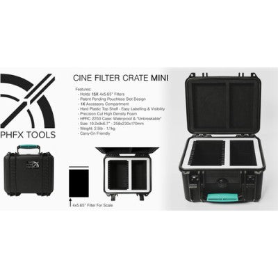 PHFX Tools Cine Filter Crate Mini (Black)Store, protect, and transport up to 15 4 x 5.65" filters with the black Cine Filter Crate Mini from PHFX Tools. The case features a precision-cut high-density foam interior with slots for each filter, and one storage compartment for accessories. Users will appreciate the latch closure with hasps for an optional padlock, as well as the slots for an optional shoulder strap. Carry your Cine Filter Crate with the robust top handle.