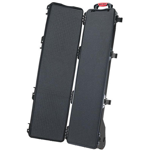 The black 6400TRIB from HPRC (High Pressure Resin Cases) is an ATA 300 rated case that is meant to hold your audio, video and photo gear in safety. This case comes with a foam interior for protection of your gear. The virtually unbreakable hard resin composition is supported on the inside by a neoprene O-ring that keeps it both air and waterproof. The addition of durable aluminum enhances the overall strength of the case. This combination of materials makes for a lighter case that translates into easier portage and lower shipping costs. The interior is empty with plenty of storage space for gear. The long design makes it perfect for storing equipment such as a tripod.