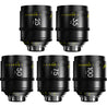 This DZOFilm Arles FF/VV Prime Cine 5-Lens Set includes five commonly used focal lengths for most cases. Included in this ARRI PL full-frame compatible set are 25, 35, 50, 75, and 100mm lenses. All the lenses share similar gearing, iris blades, front diameters, and aperture ranges for easy switching. See below for more information on the individual lenses included in this kit.