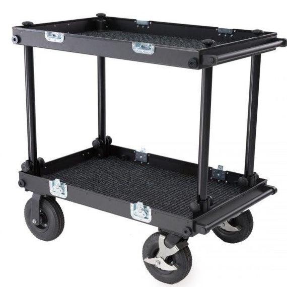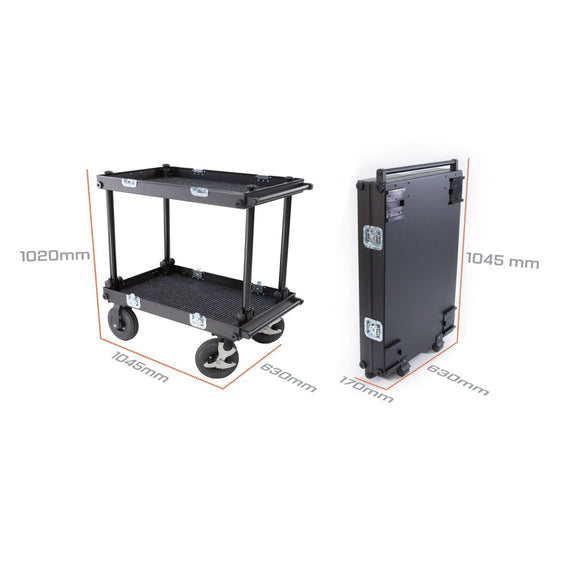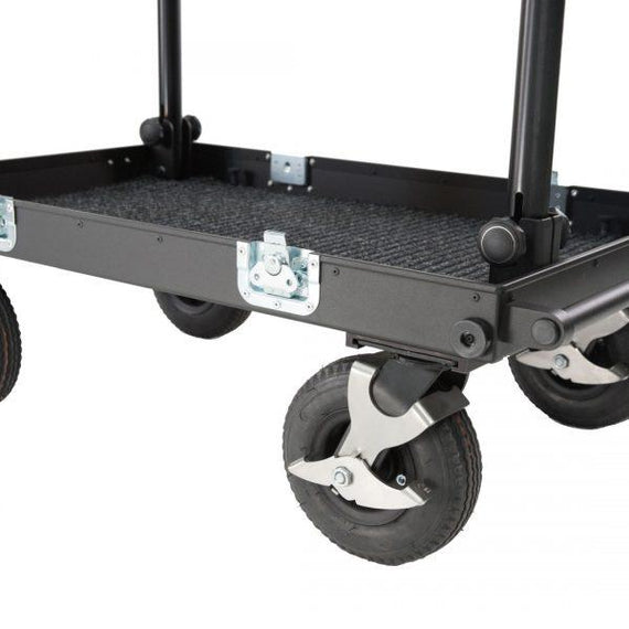 The Filmcart SMARTONE double deck cart can be use to transport equipment or as a workstation. We applied durable materials to face the harsh on set conditions, tires are made from 4-layer gum placed on strong steel rims equipped with 2 manual foot brakes with force regulation for secure and save routing on most of surfaces, aluminum structure is lightweight and sustained enough to hold up to 200 kilograms, no tools required to attach of remove each wheel or any part of the cart what saves your time. SMARTONE is super easy to collapse and ready to use in less than 2 minutes with additional dedicated accessories for installing heavy monitors, steadicam or headfixing. We developed a list of details which can improve the quality of usage like small transport wheels, props and deflects. Compact size allow the cart to transport easily all parts in one case. 220mm and 260mm diameter wheels fits inside the collpased cart.