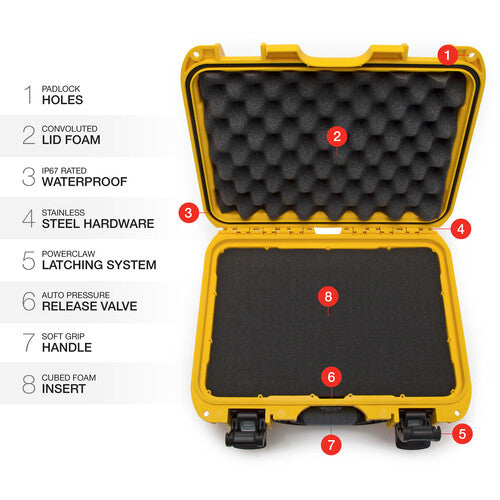 Ideal for professionals, hobbyists, and outdoor enthusiasts of all stripes, the yellow 915 Hard Utility Case from Nanuk is made from a crushproof, dustproof, and waterproof lightweight NK-7 polypropylene resin. It protects and stores delicate medium-sized items like small laptops, tablets, cameras, electronics, drones, sample kits, tools, handguns, and equipment of all sorts. This version of the 915 is offered with a cubed foam insert for its 13.8 x 9.3 x 6.2" interior and gives you the ability to remove just the foam needed to conform to the outline of your gear for maximum protection against drops and impacts during rough handling. A convoluted foam insert for the lid ensures your delicate equipment won't shift out of place.