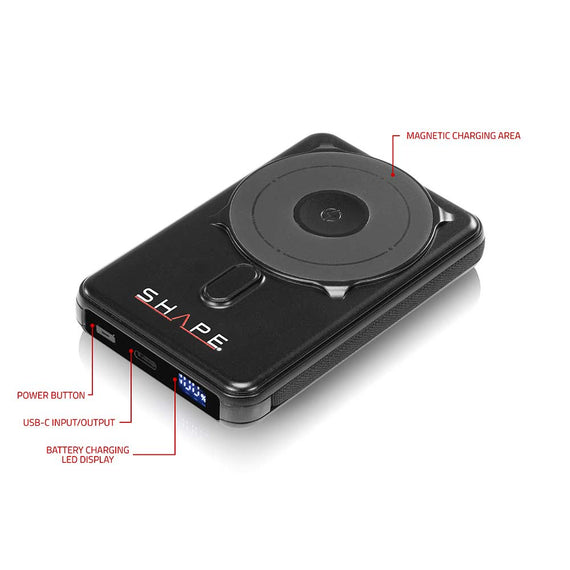 Pocket Size Wireless Magnetic Power Bank with 10000 mAh Portable Charger. Uses the newest magnetic technology & nano absorption for smartphones. 10000 mAh large capacity & smart LED display. i-Watch wireless charging. PD 20W wireless magsafe charging. Built-in Type-C & Lightning Fast Charging Cables. Zinc phone stand. Need to press on Power Button to turn on. (1 press only)., Press twice to turn off LED display. Short circuit & over current protection.